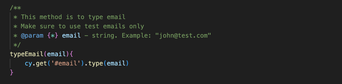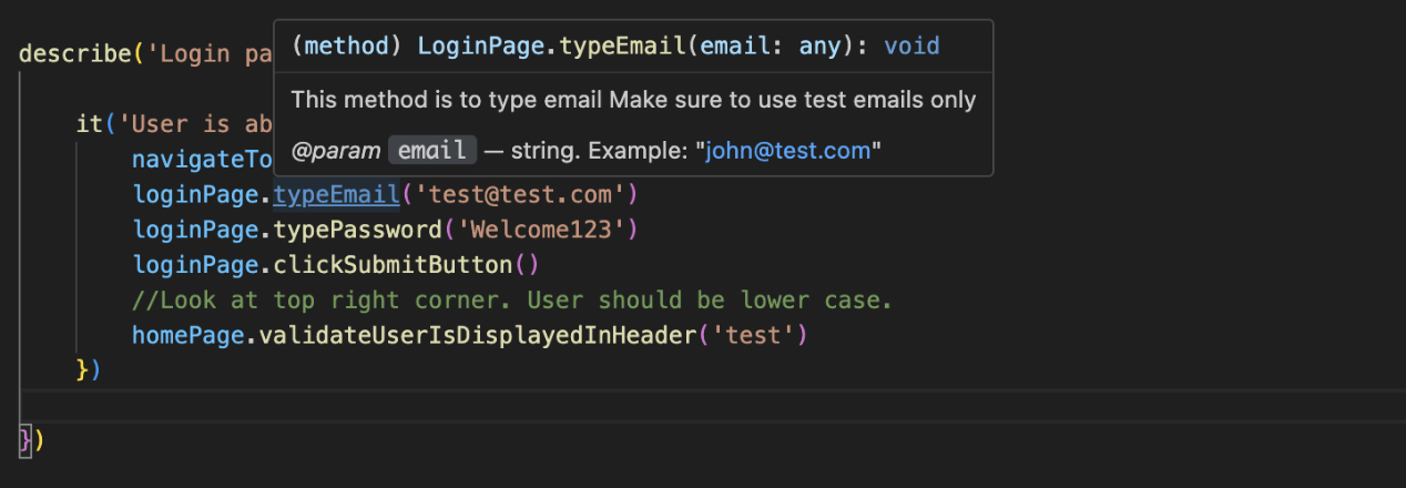 Then in the test, if you hover over the mouse above the method name, you will see a pop-up window with a description of how to use this method properly: