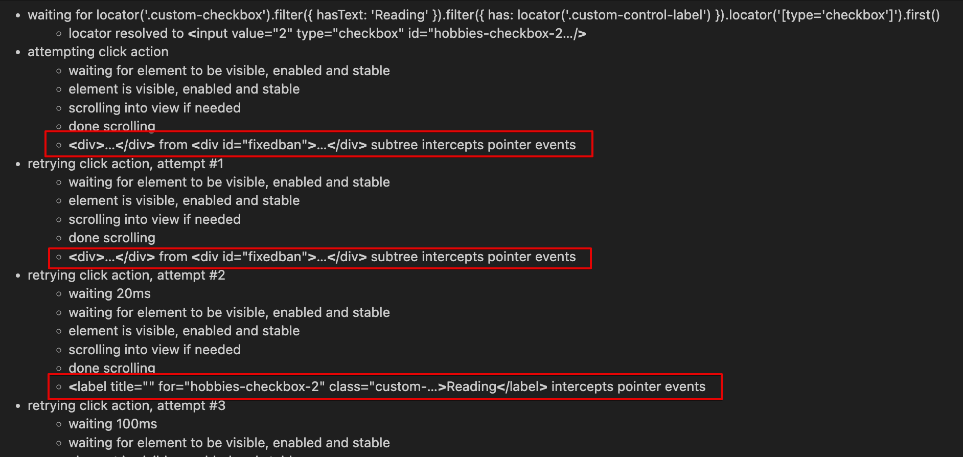 By reading the log, we can see that the first two attempts to click the checkbox were intercepted by an element with the id "fixedban". That page has a bunch of advertising banners, and probably those banners interfered with the attempt to select the checkbox. But on the third attempt, we see that the checkbox label now intercepts the pointer event. Why did that happen? Hard to say. But this label is definitely related to the checkbox we're trying to click. This label is a sibling element in relation to the <input> element of the checkbox that we need to select, and somehow receives the event instead of the <input> field.