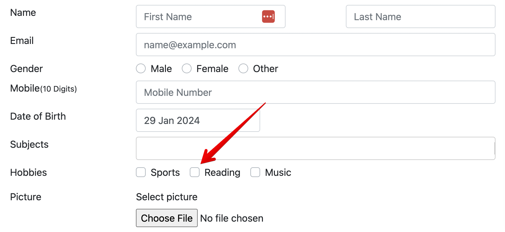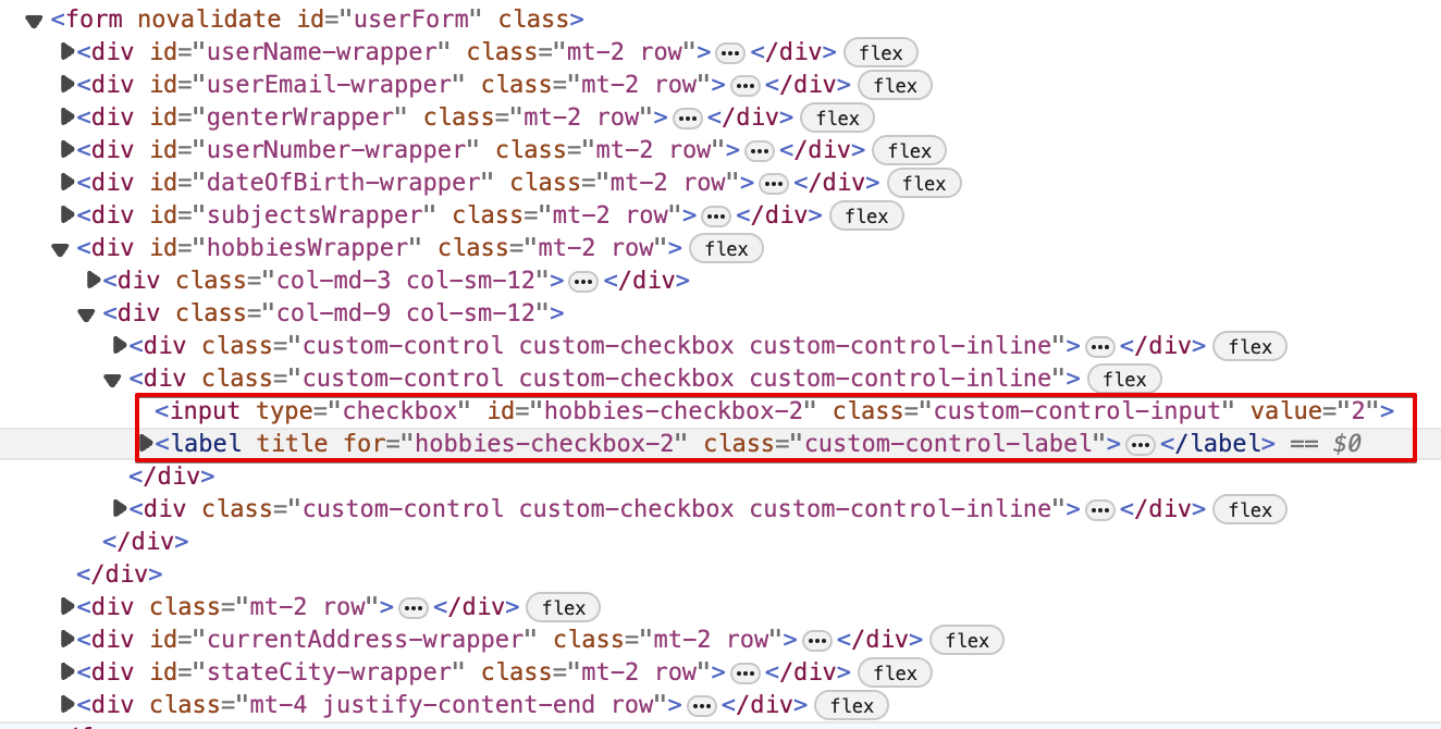 By looking at this, you may say, "easy!" There is a dedicated ID for the checkbox "hobbies-checkbox-2". Just click on that, and you are all set. Unfortunately, it didn't work.